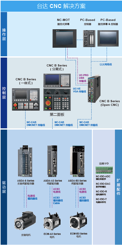 臺達新一代CNC B系列數(shù)控系統(tǒng),根據(jù)客戶需求和市場趨勢,整合HMI 平臺操作界面,可依照企業(yè)及行業(yè)需求,彈性化客制操作界面;并可搭配臺達伺服驅(qū)動器 ASDA-A3 / ASDA-B3 系列、永磁主軸系統(tǒng)及交流電機驅(qū)動器驅(qū)動主軸,以及通訊網(wǎng)絡(luò) DMCNET 等進行高速數(shù)據(jù)傳輸及控制,達到控制機床的電機定速、定轉(zhuǎn)矩與精密定位。