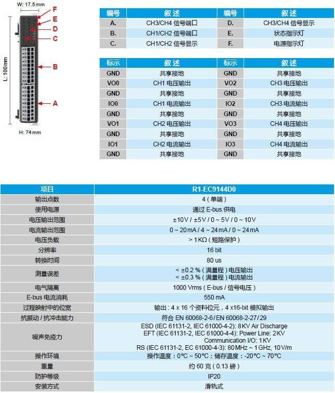 EtherCAT 4 通道模擬輸出擴展模塊 - R1-EC9144D0